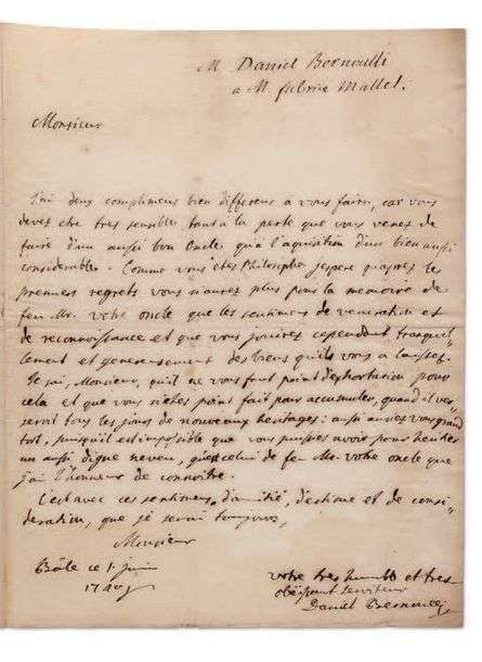 «J'ai deux complimens bien differens a vous faire, car vous devez être très sensible tant a la perte que vous venez de faire d'un aussi bon oncle qu'a l'aquisition d'un bien aussi considerable. Comme vous étés philosophe j'espere qu'aprez les premiers regrets vous n'aurez plus pour la memoire de feu Mr.