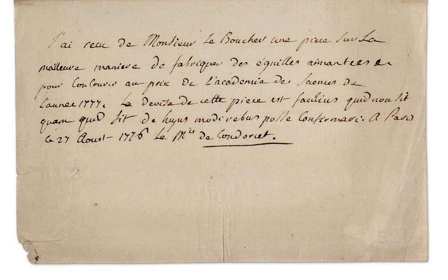 Il recoit de M. LE BOUCHER «une piece sur la meilleure manière de fabriquer des eguilles aimantées &c pour concourir au prix de l'Academie des Sciences de l'année 1777». Et il cite la devise latine de cette piece: «Facilius quid non sit quam quid sit de hujus modi rebus posse confirmari»... [Cette piece, qui a remporte le prix, partagé avec une autre due à Van Swinden, était due a Charles-Augustin COULOMB (1736-1806), capitaine au Corps royal d'Artillerie.]