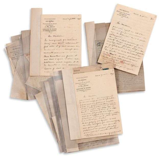 École municipale de Physique & de Chimie industrielles et avec enveloppe, 3 adresses (defauts et mouillures a certaines lettres, la plupart habilement restaurées par doublure d'une fine gaze et montées sur onglets en attente de reliure).