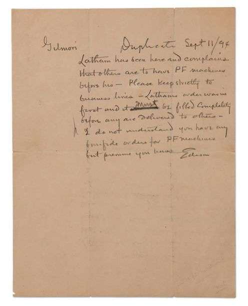 Latham est venu se plaindre que d'autrès auront des machines PF avant la sienne. Il faut respecter l'ordre des affaires. La commande de Latham est arrivée la premiere et doit être honorée avant qu'aucune ne soit livrée aux autrès. Edison ne comprend pas que Gilmore ait de sérieuses commandes pour des machines PF, mais presume qu'il en a...