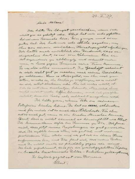 L.A.S. «Albert», 23 février 1927, à sa première femme MILEVA| 1 page grand in-4| en allemand.