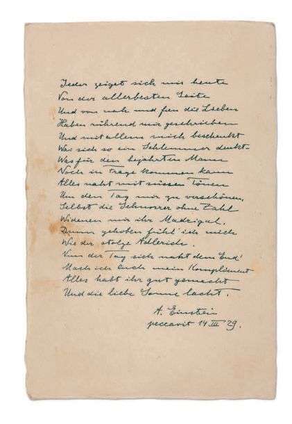Au dos du fac-similé du manuscrit du poeme composé par Einstein pour remercier des felicitations reçues a l'occasion de son cinquantieme anniversaire (date A. Einstein peccavit 14 III 29), Einstein a inscrit un quatrain demandant pardon pour le plagiat à la personne dont il s'est inspiré: «Herr, verzeih mir das Plagiat, Das ich Ihnen mausen That Ganz beschamt schleich' ich mich fort Lass dem Gegner nur das Wort».