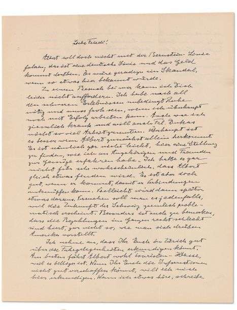 Albert ne doit absolument pas voyager avec la Bernstein-Linie| c'est une ligne allemande et l'argent va la-bas. Cela ferait aussitot un scandale si une chose pareille venait a se savoir («das ist eine deutsche Linie und das Geld kommt dorthin. Es ware geradezu ein Skandal, wenn so etwas hier bekannt wurde»). Malheureusement il ne peut pas inviter Frieda a venir elle aussi le rejoindre| Après toutes les difficultes rencontrées, il a besoin de calme. Il doit se rejouir de pouvoir encore travailler avec succes («Ich habe nach all den schweren Erlebnissen unbedingt Ruhe notig und muss froh sein, wenn ich uberhaupt noch mit Erfolg arbeiten kann»). Il a aussi été très malade... C'est donc mieux si Albert venait seul prochainement. Ce n'est pas facile du tout de trouver une place, comme il l'a appris par des parents et amis. Il se doutait qu'Albert ne trouverait pas quelque chose de sitot. Mais c'est bien qu'il puisse venir malgre tout pour nouer des relations| peut-être qu'il en sortira quelque chose plus tard. Il faut le tenter de toute facon, car l'avenir de la Suisse semble assez problematique («Versuchen soll man es jedenfalls, weil die Zukunft der