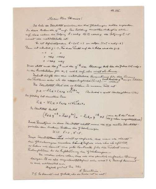 Lettre scientifique à son collaborateur, avec plusieurs formules de calculs, pour la préparation de son étude sur la relativité générale.