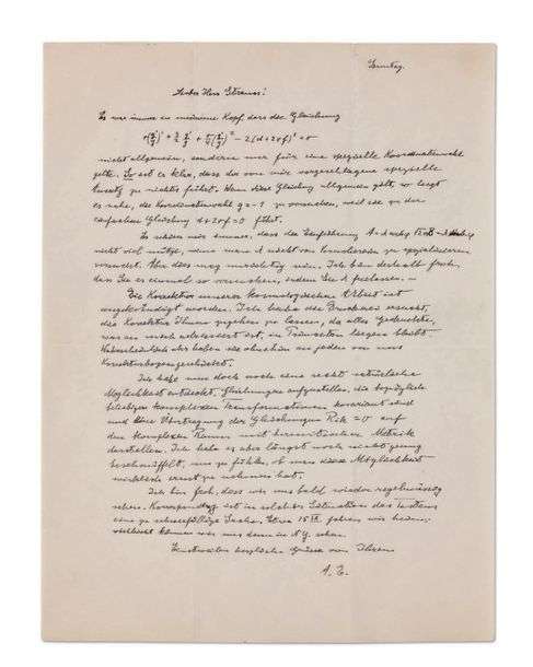 Lettre scientifique à son collaborateur, avec une équation, pour la préparation de son étude sur la relativité générale.