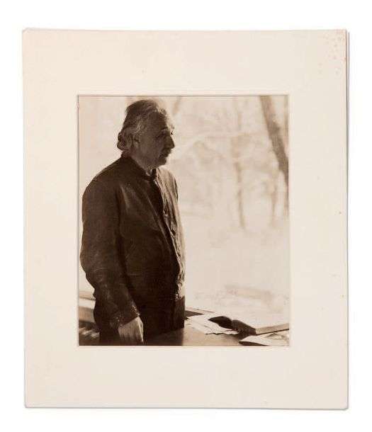 Portrait par la photographe Lotte JACOBI, New York (cachet sec en bas a droite), representant le savant de trois quarts, habillé d'un blouson, debout devant une table chargée de papiers et livre ouvert. Einstein a dedicace la photo: «To Mr Ben Samuel Albert Einstein 1947».