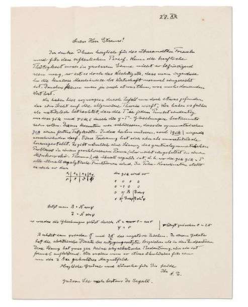 [Ernst Gabor Straus a récemment quitté Einstein pour un poste à Los Angeles. Eins-tein a publié au début de l’année son article capital, A Generalized Theory of Gravitation, dans Reviews of Modern Physics (1er janvier 1948), qui fait le point sur ses recherches qu’il commente longuement dans cette lettre.] Il remercie Straus de sa lettre, et le réconforte : même si le travail professionnel n’est peut-être pas très satisfaisant, la chose la plus importante est d’être intégré dans l’étrange machinerie del’économie | et on peut faire à côté quelque chose de valeur plus durable : « Wenn die berufliche Thätigkeit auch in gewissen Sinne nicht so befriedigend sein mag, so ist es doch das Wüchtigste, das man irgendwie in die kuriose Maschinerie der Wirtschaft normal eingereiht ist. Daneben kann man ja auch etwas thun, was mehr dauernden Wert hat ».