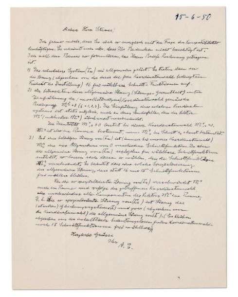 bestimmt ist. 3) Bei einer beliebigen Losung von (Ia) ist (immer bei unserer Koordinatenwahl) M4 0 keit uberzeugt zu haben glaubten!)». Il lui envoie la correction d'un travail, qui pourrait former l'appendice de son petit livre sur la relativite («Appendix meiner