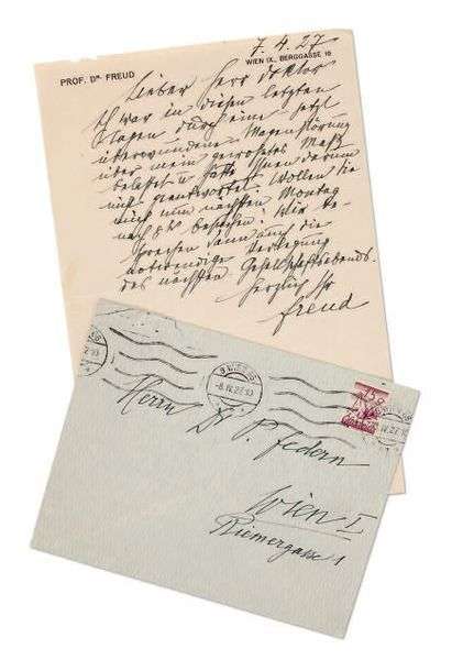 L.A.S., Wien, IX, Berggasse 19 7 avril 1927, au psychanalyste Paul FEDE RN à Vienne| 3/4 page grand in-8 à son en-tête et adresse, enveloppe| en allemand (infime manque au bord supérieur sans toucher le texte).