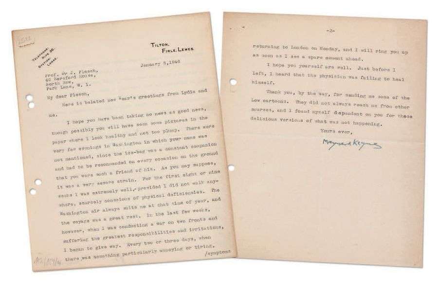 L.S., Tilton, Firle, Lewes 5 janvier 1946, au Dr Janos PLESCH| 2 pages et demie in-4 dactylographiées| en anglais (trous de classeur).