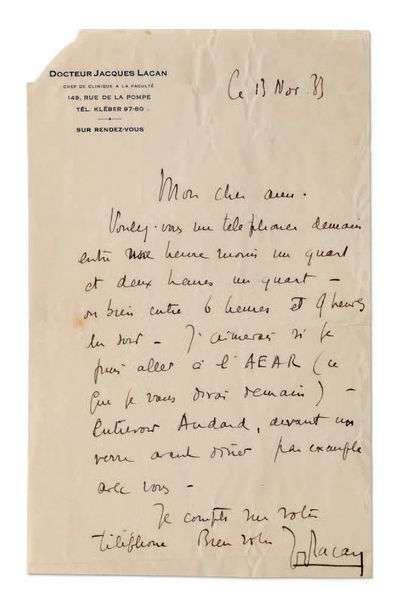 Docteur Jacques Lacan chef de clinique à la Faculté (un peu froissée, un coin manquant sans perte de texte).