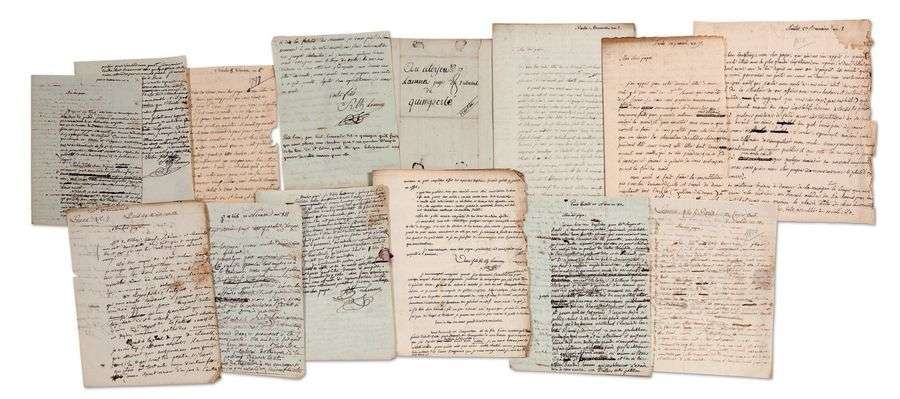 13 L.A.S., Nantes, Quimper et Paris 1794-1805, à son pere Theophile-Marie LAENNEC, juge au tribunal de Quimperle, puis a celui de Quimper (Finistere), puis homme de loi a Port-Brieuc (côtés-du-Nord), jurisconsulte ou avocat a Quimper| 31 pages in-4, adresses (legeres mouillures et bords un peu effranges a quelques lettres).