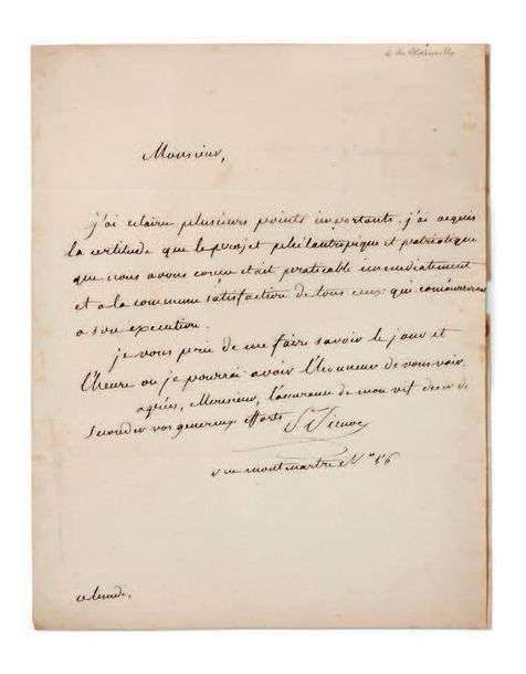 J'ai acquis la certitude que le projet philantropique et patriotique que nous avons concu etait praticable immediatement et a la commune satisfaction de tous ceux qui concourreront a son execution. Je vous prie de me faire savoir le jour et l'heure ou je pourrai avoir l'honneur de vous voir. Agréez, Monsieur, l'assurance de mon vif desir de seconder vos genereux efforts»... Il donne son adresse: «rue Montmartre N° 56».