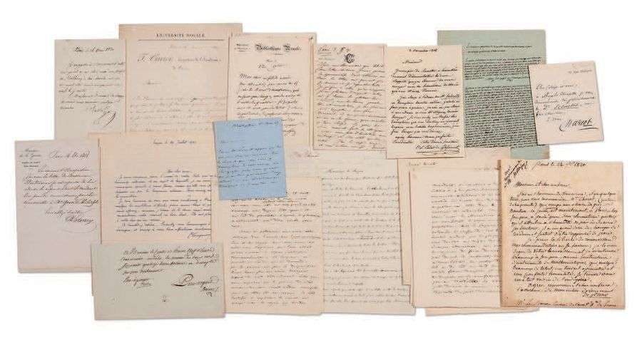 CAMUSET (amusante lettre avec dessins, a la veille de son «premier jour d'oculistisme sur une vaste echelle. Gare les yeux!»), Jean-Jacques CHAMPOLLION-FIGEAC (6, a Jacques Hittorff, Pierre-Paul Royer-Collard, au libraire Lacombe, a l'éditeur Bailliere etc.), Jean-Martin CHARCOT, Georges-Frederic