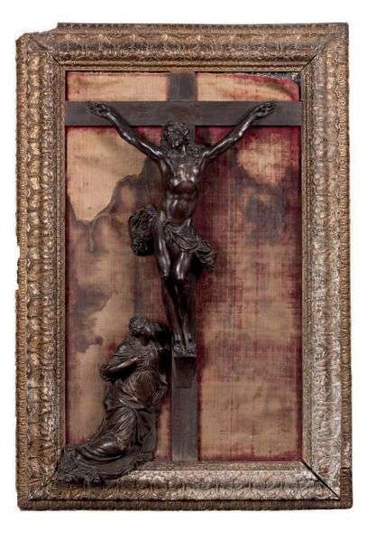 TABLEAU CRUCIFIX en bois dit de sainte Lucie. Christ en croix sur fond de velours cramoisi avec, au pied, Marie-Madeleine agenouillée, essuyant son visage avec un linge| cadre en bois sculpté de feuillages et doré, Est de la France, Nancy, vers 1700
