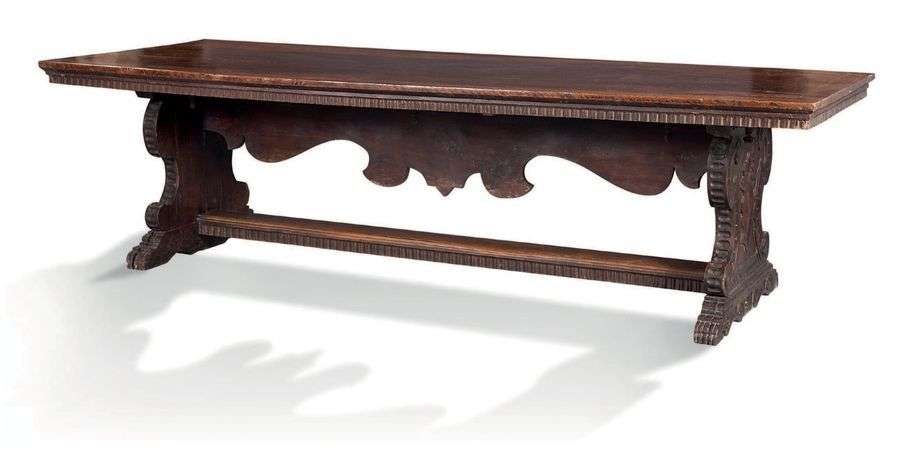 IMPORTANTE TABLE DE PALAIS en noyer sculpté. Pieds en éventail à décor de cartouches et d'enroulements reposant sur des patins moulurés ornés de volutes reliés par une barre d'entretoise| bandeau découpé sous le plateau| ceinture de plateau à décor de coups de gouge.