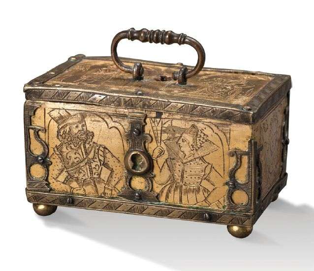 COFFRET ATELIER DE MICHAEL MANN Coffret miniature en fer gravé et doré, orné toutes faces de représentations d'hommes et de femmes en costume de la Renaissance et de volatiles. Poignée sommitale et quatre petits pieds boules.
