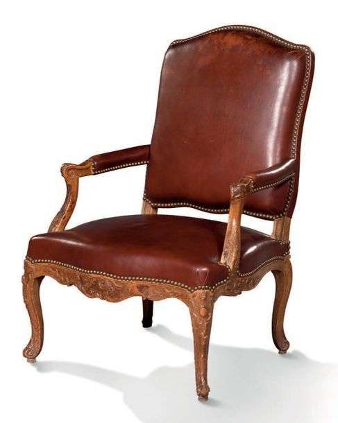 FAUTEUIL à dossier plat en bois naturel mouluré et sculpté de coquille et acanthes.