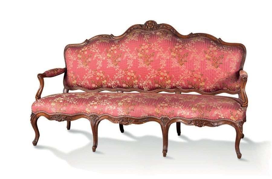 CANAPÉ en noyer naturel mouluré et richement sculpté de fleurettes, feuillages et acanthes.
