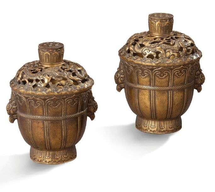 PAIRE DE BRÛLES-PARFUM en bronze ciselé, couvercle à décor ajouré de figur