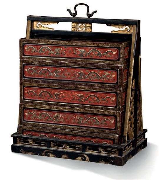 COFFRE DE MARIAGE en bois laqué polychrome, noir et rouge et réhauts dorés à cinq compartiments à décor de dragons affrontés et décor à l'échantillon| Poignées de transport en fer forgé