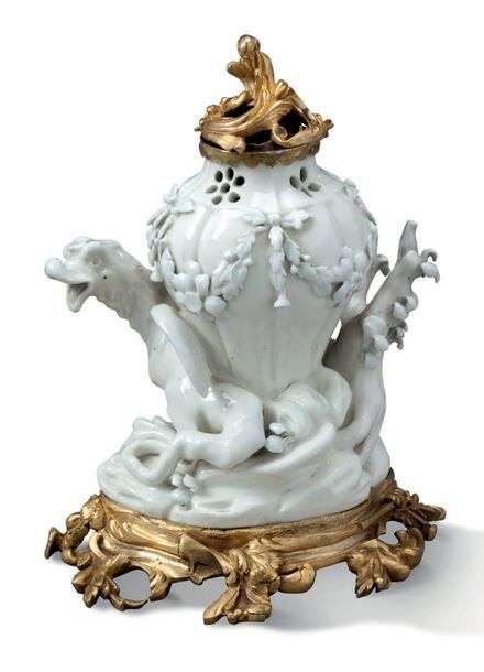 La panse ovoïde est ornée de larges godrons et de guirlandes fleuries et feuillagées.
