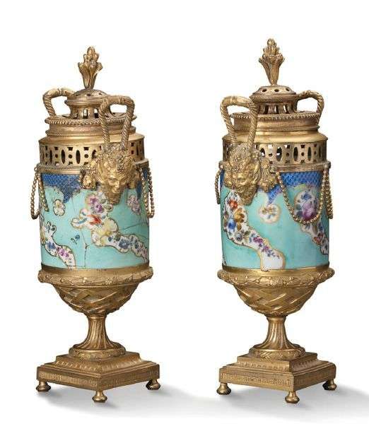 PAIRE DE VASES COUVERTS DE FORME URNE en bronze ciselé doré et céramique émaillée de frises de fleurs polychromes dans des réserves au contour rehaussé à l'or sur fond bleu. Les prises sont formées de masques et de pampres.