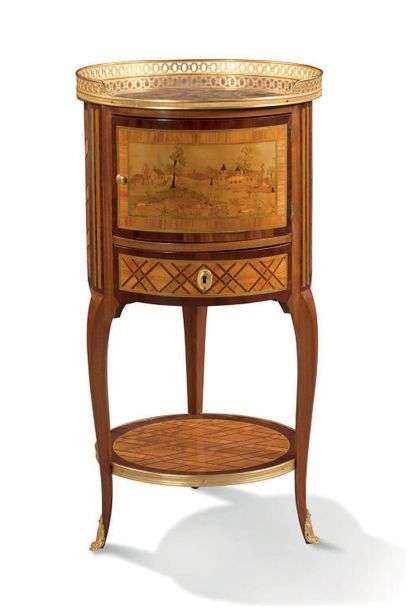 PETITE TABLE TAMBOUR en placage de bois de violette, de satiné et filet de bois verdi marqueté d'un paysage et de bandes croisées. Elle ouvre par un abattant et un tiroir en façade. Piètement tripode réuni par une tablette d'entretoise.