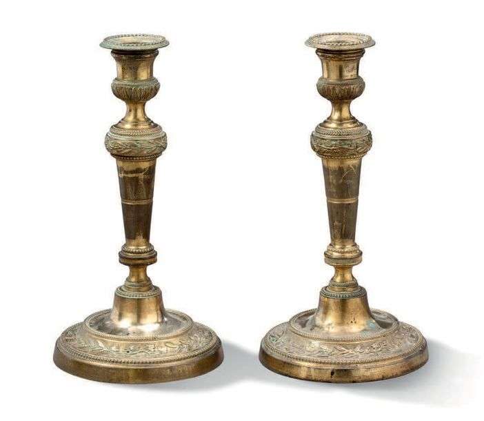 PAIRE DE FLAMBEAUX en bronze ciselé et doré à décor de rangs de perles et frises de lauriers et feuilles de vigne.