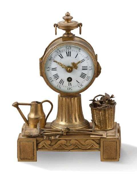 PETITE PENDULE en bronze ciselé et doré aux attributs du jardinage. Le cad