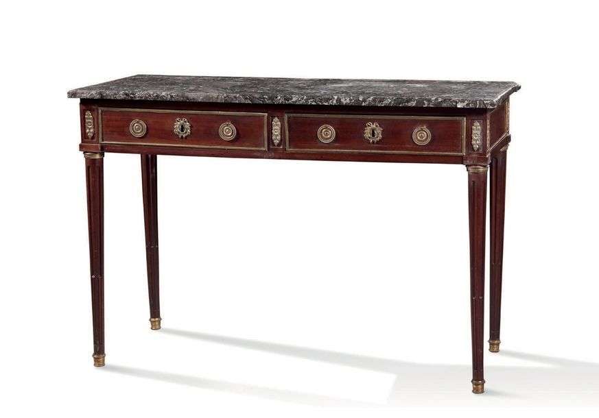 Elle ouvre par deux tiroirs en façade et repose sur des pieds fuselés à cannelures rudentées.