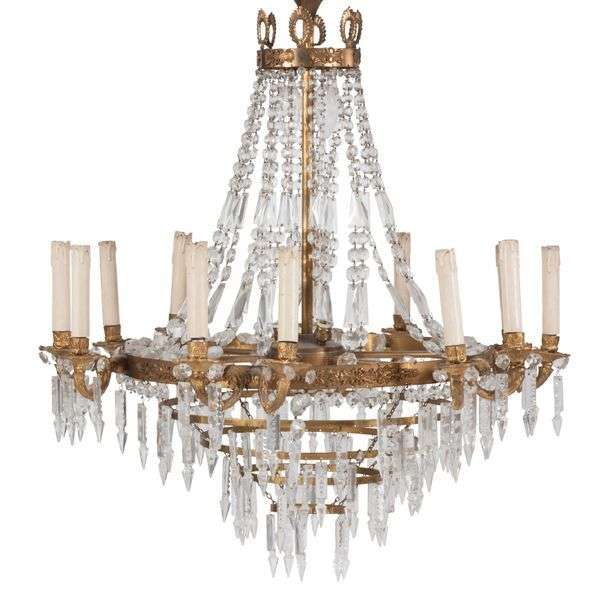 LUSTRE CORBEILLE en bronze ciselé et doré et pendeloques en cristal taillé