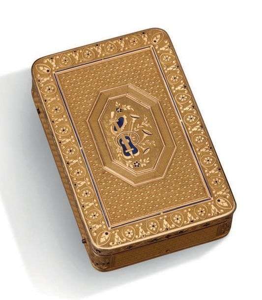 BOITE À MUSIQUE RECTANGULAIRE en or jaune 18k et émail bleue à décor guilloché de fleurettes et au centre d'un cartouche aux attributs musicaux. Les encadrements et écoinçons ciselés de frises de fleurettes et fleurons émaillés bleu sur fond amati.