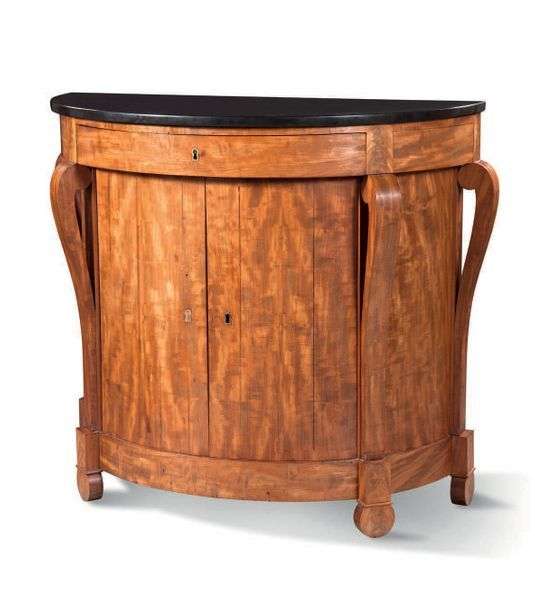 PAIRE DE BUFFETS DE FORME DEMI-LUNE en acajou et placage d'acajou, ils ouvrent par un tiroir et deux vantaux en façade, quatre montants en console.