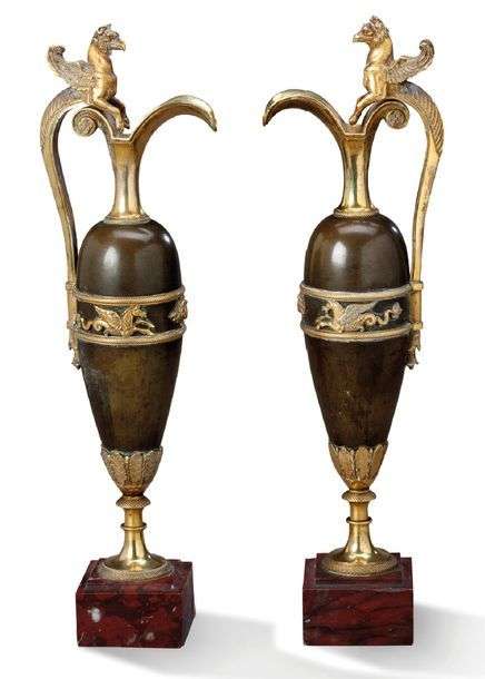PAIRE D'AIGUIÈRES en bronze ciselé à patine brune et dorée à prise formée de griffons ailés. Le fût balustre est orné au centre d'une frise de masques et de chevaux ailés et repose sur une base circulaire à feuilles de chênes. Contre socle carré en marbre rouge griotte.