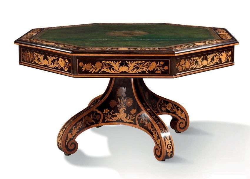 Il repose sur un pied quadripode en console, lui aussi richement marqueté.
