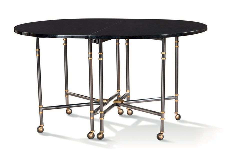 Table de salle à manger modèle «royal», deuxième moitié du XXe siècle En bois laqué noir, en deux parties basculantes, piètement octopode pivotant en laiton patiné et en partie doré terminés par des roulettes