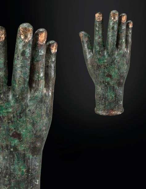 Bel ex-voto en forme de main ouverte. Le style est réaliste, les ongles semblent dorés à l’electrum. Légèrement plus petite que nature notons une forte présence sculpturale.