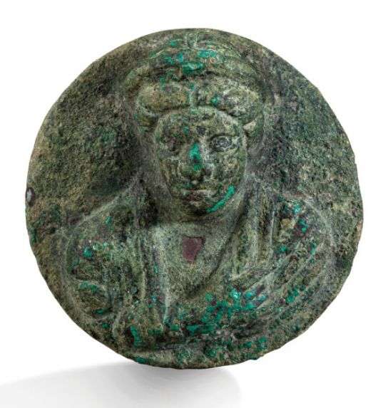 L’ornement circulaire est agrémenté d’un buste de femme. Matrone ou divinité.
