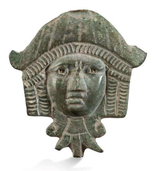 A ROMAN BRONZE APPLIQUE : COMEDIAN MASK. CIRCA 1ST - 4TH CENT A.D.