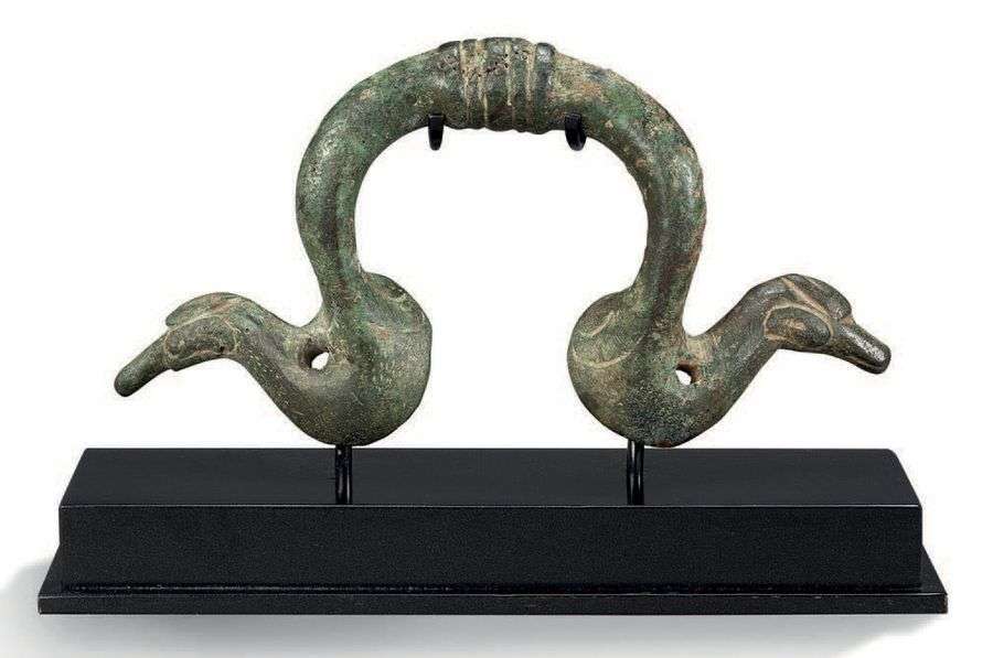 A GREEK HYDRIA BRONZE HANDLE WITH DUCK HEADS. CIRCA 4TH CENT B.C.