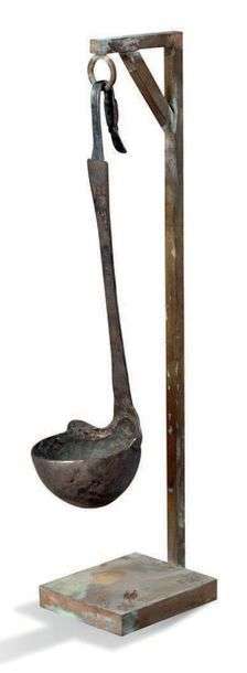 Accessoire du service de vaisselle de table, cette louche présente un récipient hémisphérique. Le manche effilé se termine par une tête de canard.