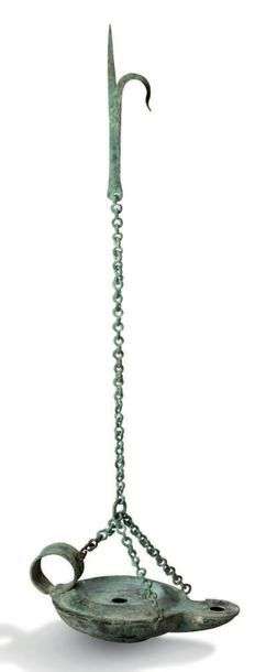 A ROMAN BRONZE OIL LAMP WITH INSTRUMENT. CIRCA 1ST - 2ND CENT A.D.