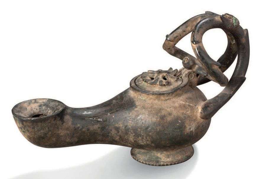 Lampe à huile à long bec. Réservoir fermé par un petit couvercle en forme de tête de grotesque.