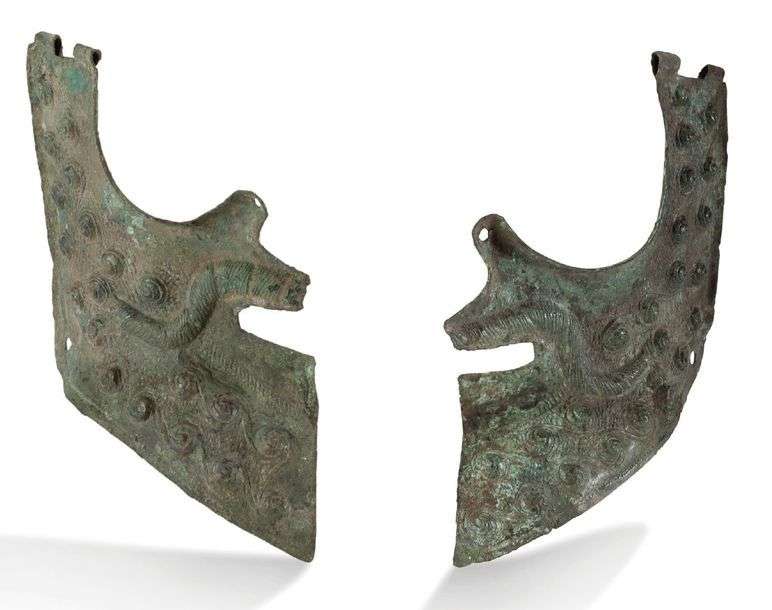 RARE PAIRE DE PARAGNATHIDES ANATOMIQUES DE CASQUE PHRYGIEN. ART GREC, THRACE, IVE S. AV. J.-C.