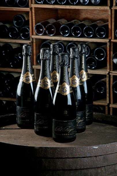 6 Blles Champagne - 2004 - Pol Roger - état/ condition: Coiffes et étiquettes sont très légèrement griffées et leurs dorures s'effritent. Une coiffe est fortement abîmée et son médaillon est manquant. / Foils and labels are very slightly nicked and show slightly flaking gilded paint. One foil is badly damaged and its médaillon is missing.