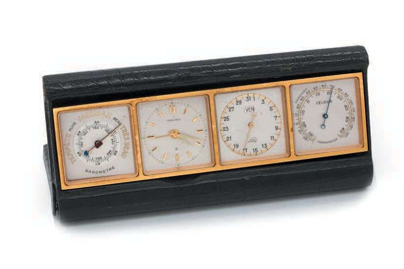 Pendulette de bureau avec alarme, calendrier, baromètre et thermomètre. Boîtier gainé de cuir de crocodile noir. Cadrans multiples: baromètre, thermomètre, triple calendrier, indication des heures et minutes avec fonction alarme