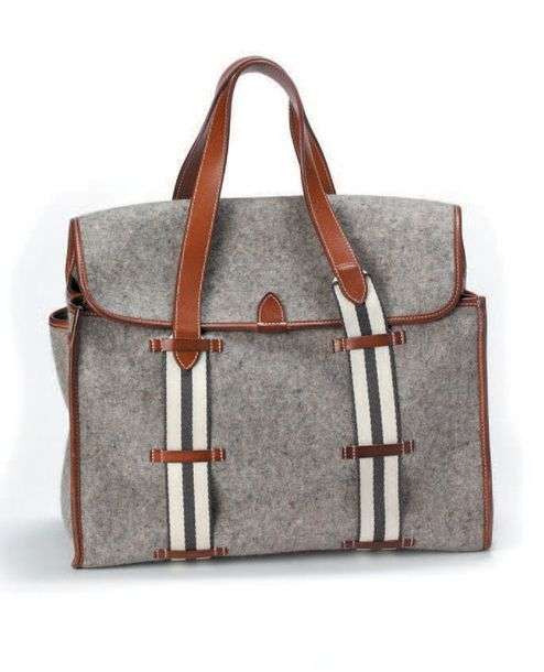 Sac cabas en feutre gris et cuir naturel marron, bandes en tissu écru et gris anthracite. Double anses. Etat neuf.