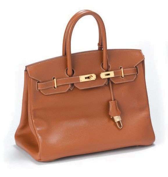 "Birkin 35" en cuir grainé marron, couture blanche, garniture en métal doré.