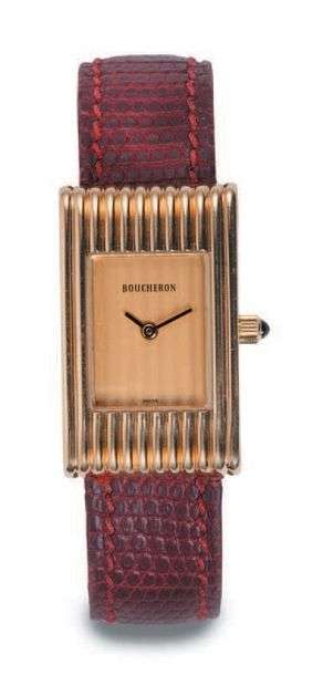 Montre de dame en or jaune 18K (750), boitier rectangulaire lunette godronnée, fond doré, aiguilles droites. Bracelet en cuir rouge, attaches cylindriques sur le boîtier. Mouvement à quartz. Cadran, boîtier, mouvement et bracelet signés.